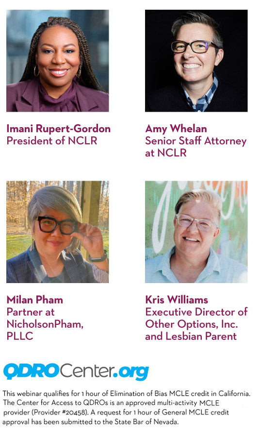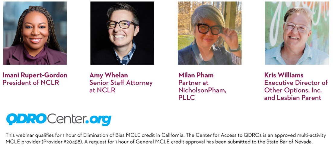 Join NCLR for a virtual panel detailing the latest developments in family law and how these challenges stack up against the historic fights led by NCLR. NCLR President, Imani Rupert-Gordon and Senior Staff Attorney Amy Whelan, will be joined by Milan Pham, a member of NCLR’s National Family Law Advisory Council, and Kris Williams, an NCLR client and parent with a current challenge pending before the Oklahoma Supreme Court.